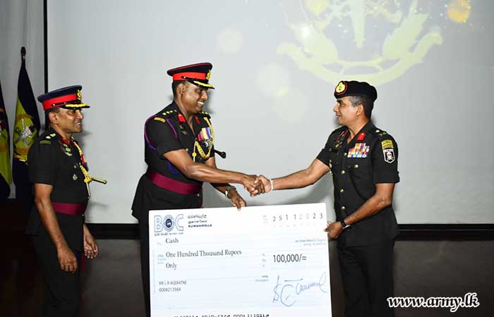 A representative group of Officers of both those Courses having collected the cash gift among themselves handed over the cheque to that value to Major General M.T.I Mahalekam WWV RWP RSP USP ndu psc, Commandant, SLMA after recalling memories of their fallen course-mates.