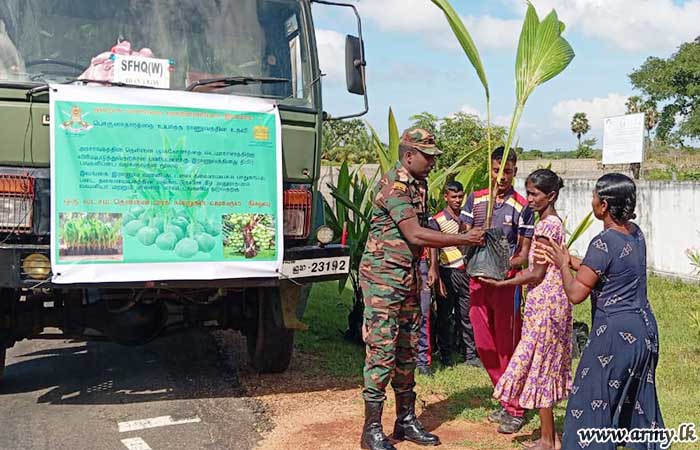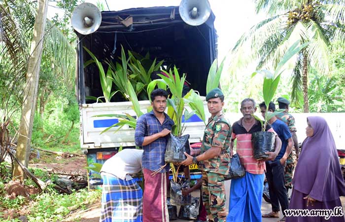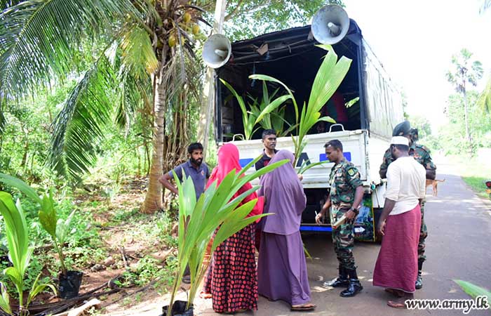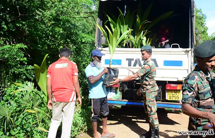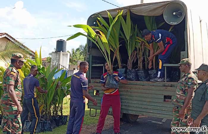 Troops of the 10 (V) Gemunu Watch and the 5 (V) Mechanized Infantry Regiment under the 541 Infantry Brigade took those coconut saplings to their doorsteps on 26 November 2023 following information provided by respective Grama Seva officials in response to a request made by the General Officer Commanding 54 Infantry Division and the Commander 541 Infantry Brigade.