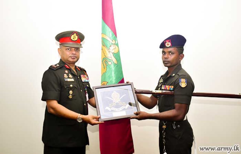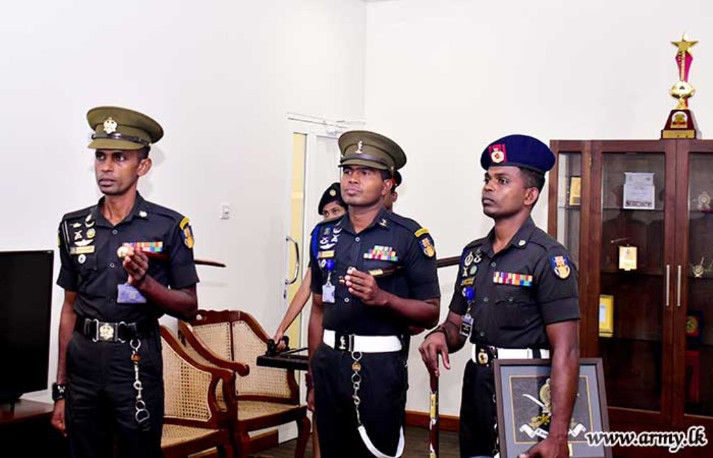The Adjutant General (AG) of the Army, Major General S.R.B Aluvihare RWP RSP ndu psc after inviting the Warrant Officer I W.P.D.R Weerasinghe, the Regiment Sergeant Major (RSM) at the Army Headquarters, Warrant Officer I H.M.P.A Herath, the Drill Instructor (DI) at the Army Headquarters, and the Warrant Officer II M.G.E.R Lakpriya, the Assistant Drill Instructor at the Army Headquarters recently to his office appreciated their commitment and significant roles, played for the success of the recently-concluded Army Inter Regiment Drill and Pace Stick Competition – 2023.