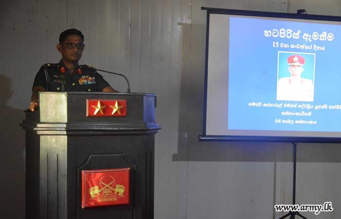 On the anniversary day (10 Dec), a Guard Turnout and a parade saluted the General Officer Commanding (GOC), 64 Infantry Division, Major General M.S Devapriya USP ndc on his arrival at the camp premises. Afterwards, he recalled the memories of the Division delivering a special address to All Ranks.