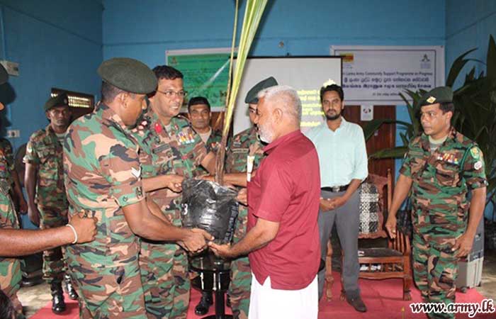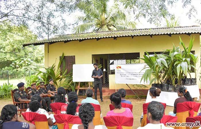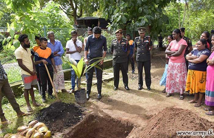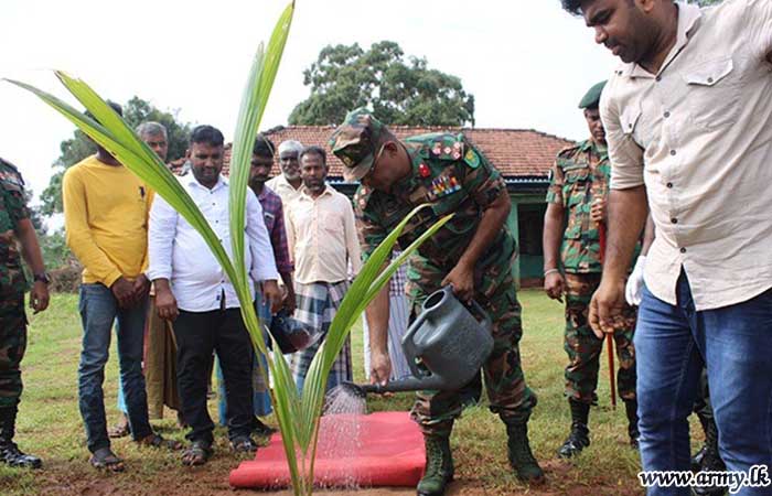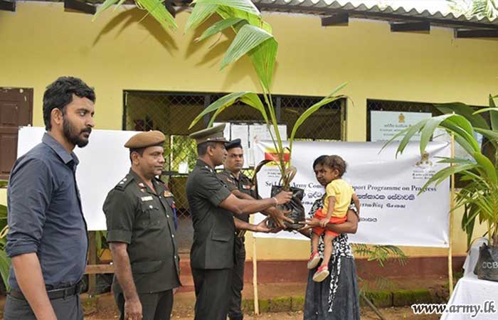 The distribution was made by the troops by visiting the doorsteps as per instructions given by the Commander, Security Forces - Wanni, Major General W.P.A.D.W Nanayakkara RSP VSV USP ndu Required coconut saplings were provided by the Coconut Cultivation Board.