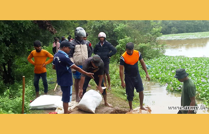 Upon reaching the location, the troops cooperated with local civilians. The guidance of officials from the Marailuppai Agrarian Services Department enabled the repairs to the damaged tank bund by placing sandbags.