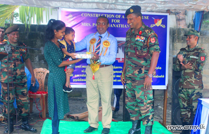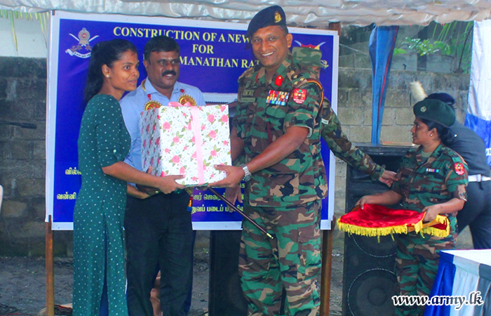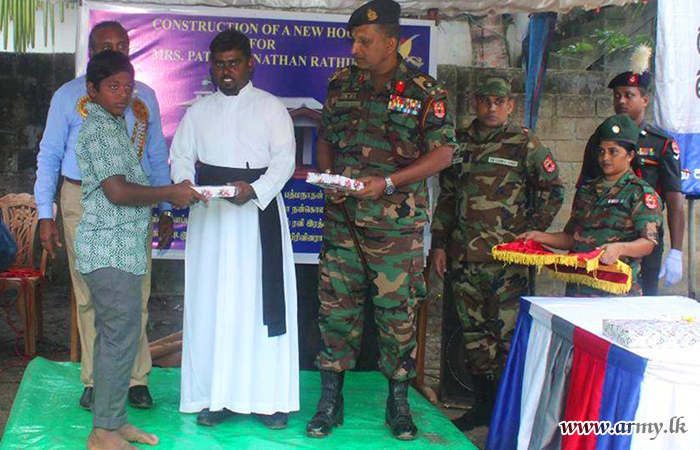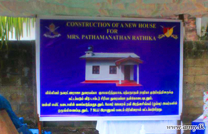 Accordingly, 7 Battalion Sri Lanka Light Infantry troops undertaking the project laid the foundation stone and began construction of the house providing man power and technical expertise for the proposed house for the deserving family of Mrs. Padmanathan Radhika in Udayanagar East, Kilinochchi The construction of the proposed house got underway with the supervision of the Commander of the 551 Infantry Brigade under the guidance of the General Officer Commanding, 55 Infantry Division.