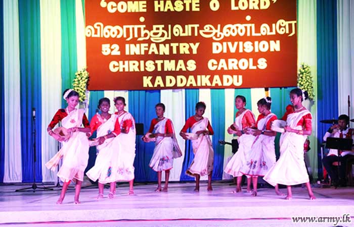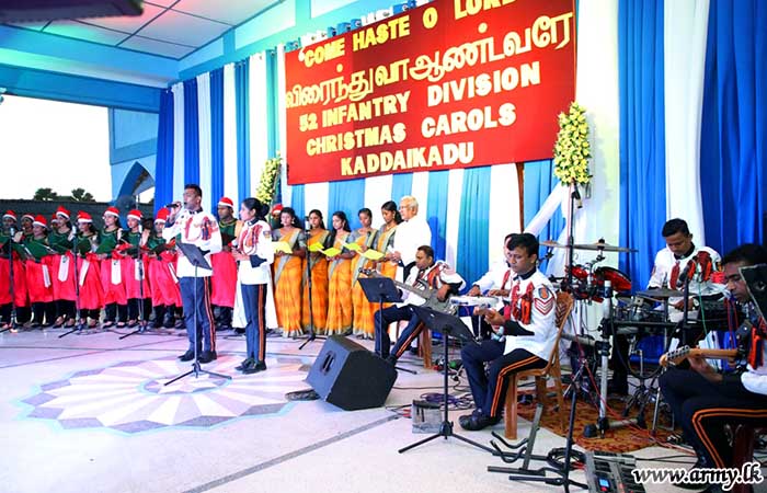 The troops under the 52 Infantry Division arranged a Christmas carols on Friday (29 December) at Kaddaikadu church. Major General Y.A.B.M Yahampath RWP RSP ndu psc, General Officer Commanding, 52 Infantry Division, graced the occasion as the chief guest, and the guest of honor was Right Reverend Dr. Justin Bernard Gnanaprakasam, the Bishop of Jaffna. Nearly 2000 civilians from the Kaddaikadu area participated in the event.