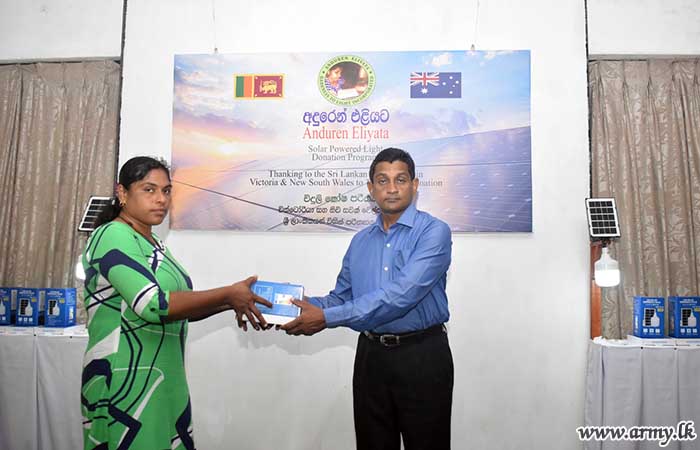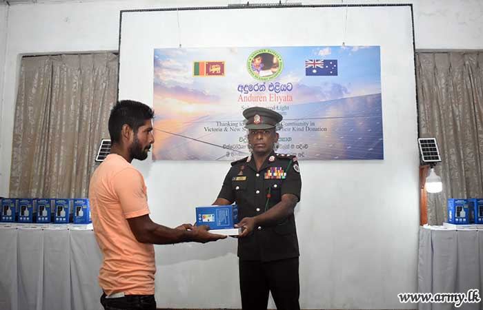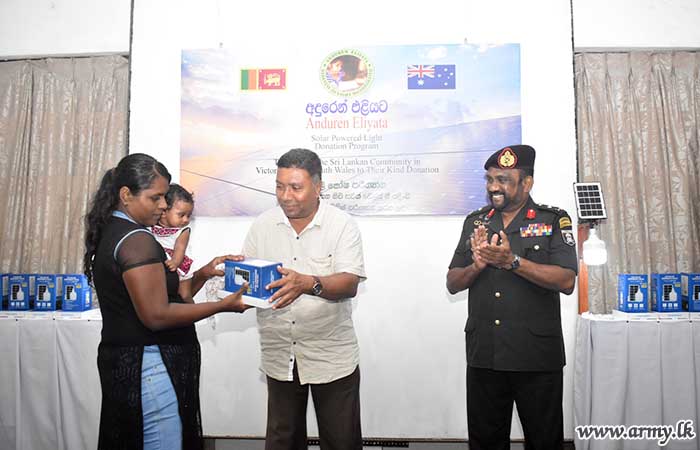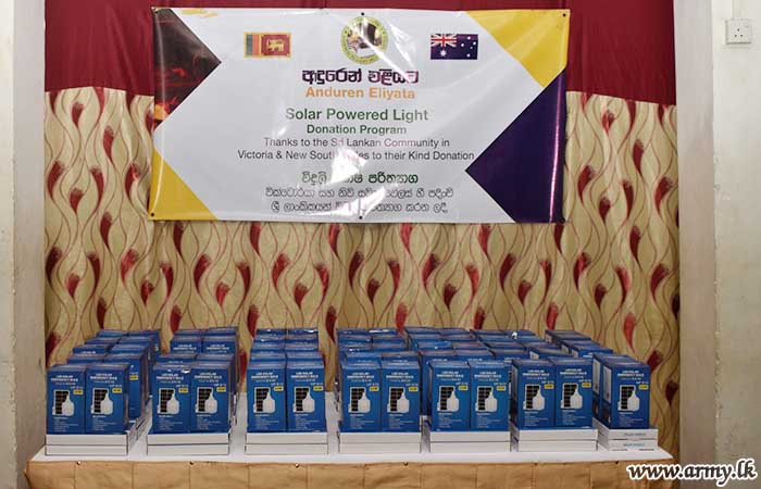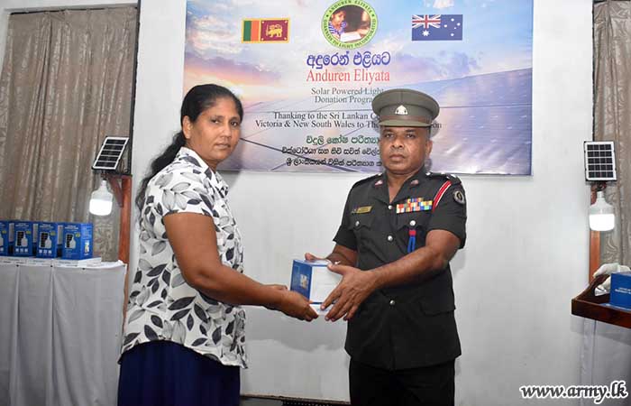The Anduren Eliyata Solar Powered Light donation program, conducted under the guidance of Major General H.D.W.K.N Eriyagama RWP RSP, General Officer Commanding, 58 Infantry Division, provided solar-powered lights to 65 families in need in Sinnavilluwatta, Puttalam District on 29 December 2023. The program prioritized families with school-going children who lacked access to electricity.