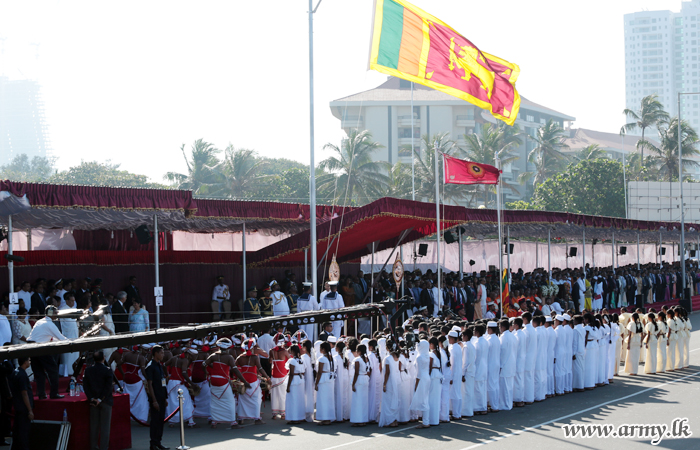 Seconds after that, the Chief of Defence Staff, Commander of the Army, Commander of the Navy, Commander of the Air Force and the Inspector General of Police conducted HE, the President to the main flag post where he was invited to hoist the National Flag, amidst rhythmic beating of Magul Bera (auspicious drums) and blowing of conch shells as 110 students from eleven girls’ schools in the province, recited the national anthem, filling all patriotic hearts with pride and grandeur.