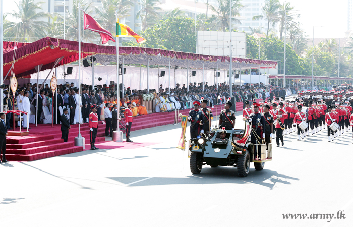 Glittering National Flags and military parades saluted President and the Nation during 69th Independence Day ceremonies at Colombo, giving pride of place to the military parade of the Tri-Services, Police and the Civil Security Department.