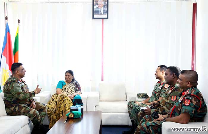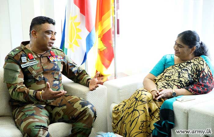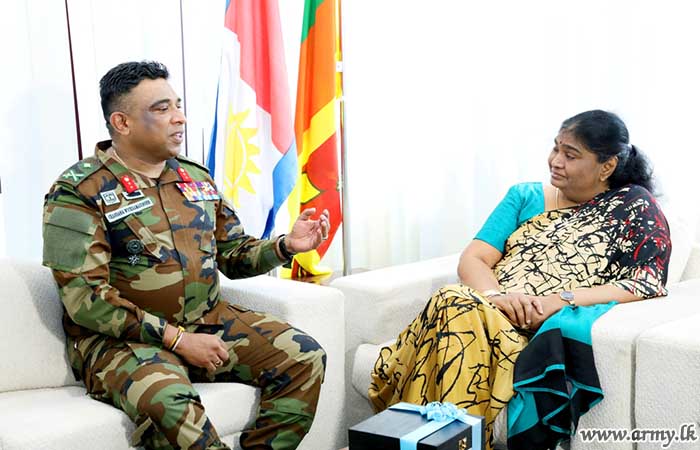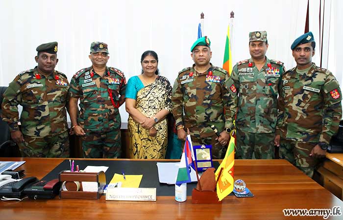 During the meeting, the Commander, SF - J briefed the Governor on the security and humanitarian activities persisting in Jaffna and Kilinochchi. The Governor expressed her concern about developing skills of women-led families, assisting them financially to uplift their wellbeing. Furthermore, during the discussion, both parties discussed matters pertaining to welfare, the wellbeing of civilians and civil-military cooperation in the peninsula.