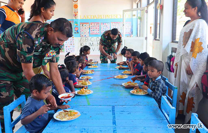 Troops of 11 Field Engineer Regiment (11 SLE) launched a programme to provide a free lunch treat to the children learning at Lakdaru preschool, Nawatkuli under the guidance of the Commanding Officer of 11 SLE, Lieutenant Colonel K.G.C.K. Kudagamage on 12 March 2024.