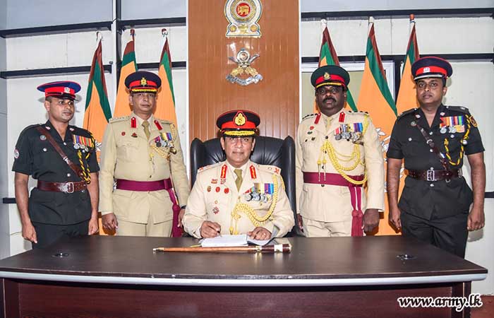 Then, symbolizing his acceptance of the new office amidst religious observances, Major General S.A. Kulatunge RWP RSP VSV USP psc, left his signature in an official document in the presence of a gathering of Senior Officers. Adding memories to the day, the Senior Officer was invited to pose for a few group photographs with the Regimental staff and was also invited to plant a mango sapling in the compound.