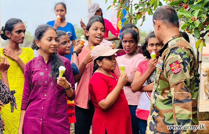 As part of the festivities, 55 Infantry Division and its under-command formations hosted 'Vesak Dansal' event, offering buns, biscuits, cool drinks to over 2500 civilians in the Kilinochchi area and ‘Bhakthi Gee’ (devotional songs) event was held in the evening.