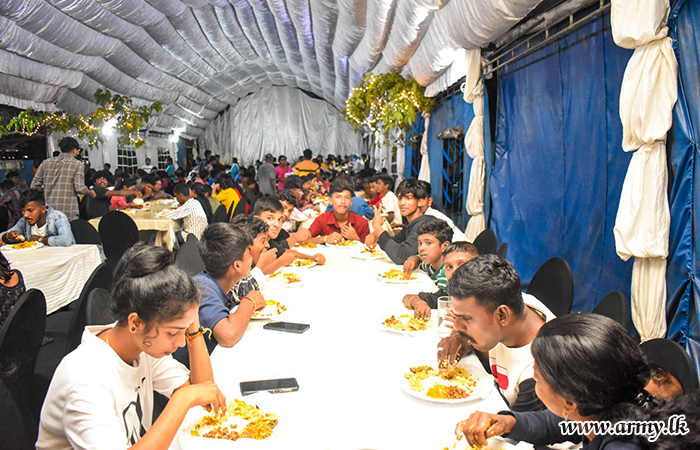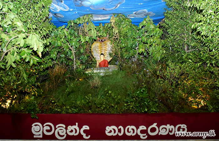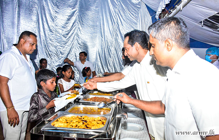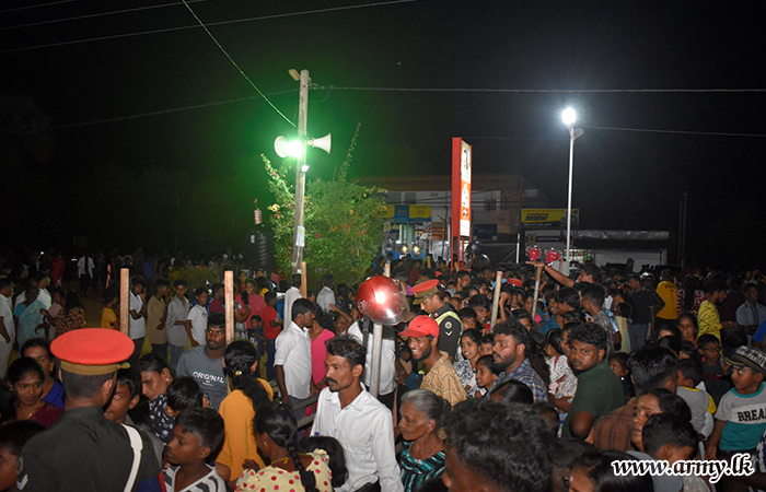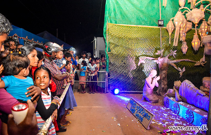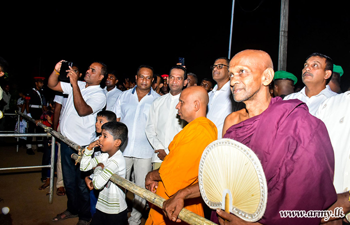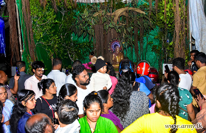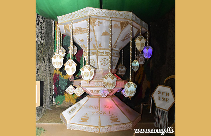 As part of the festivities, 1 Corps and its under-command formations hosted vesak dansal event, offering rice packets to over 6000 civilians in Iranamadu and Killinochchi areas. During the programme, the Commander, 1 Corps declared open the Vesak lanterns amidst religious observances. Afterwards, the gathering conducted a tour and the Commander, 1 Corps appreciated the efforts of troops. The decorations were done by Headquarters 1 Corps with the support of troops of under command units. Moreover, Army troops performed a chorale of Bakthi Gee (Songs of religious devotion) to increase the attraction of the event.