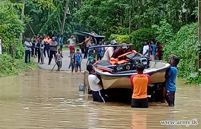 Troops of the 61 Infantry Division conducted a rescue mission to aid flood victims in the Matara District, specifically in Kadduwa, Wellathota, and Dolegoda Regional Secretariat Divisions on 03 June 2024. Under the guidance of the General Officer Commanding of the 61 Infantry Division, the mission utilised two boats allocated for rescue operations.
