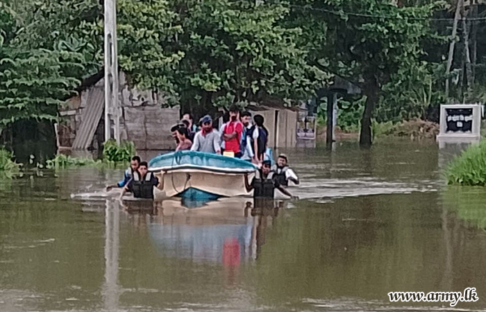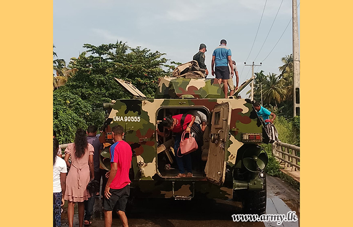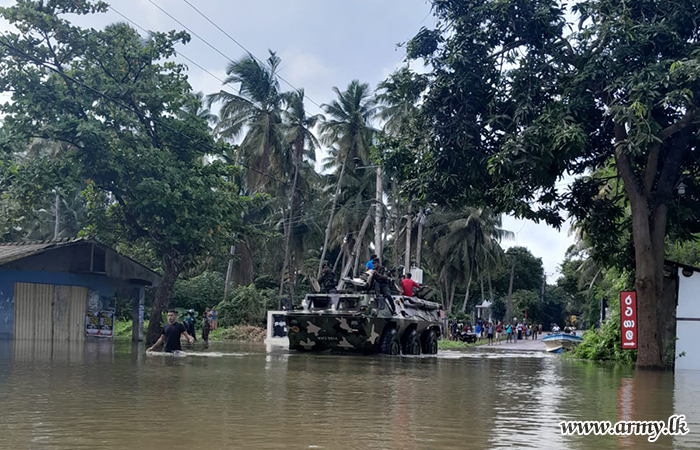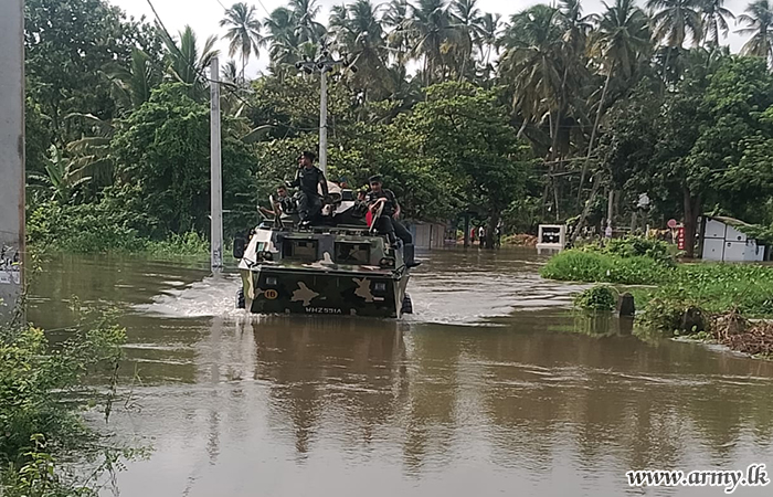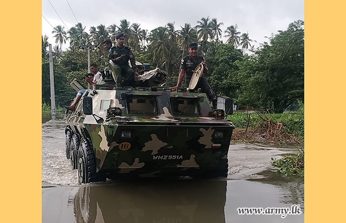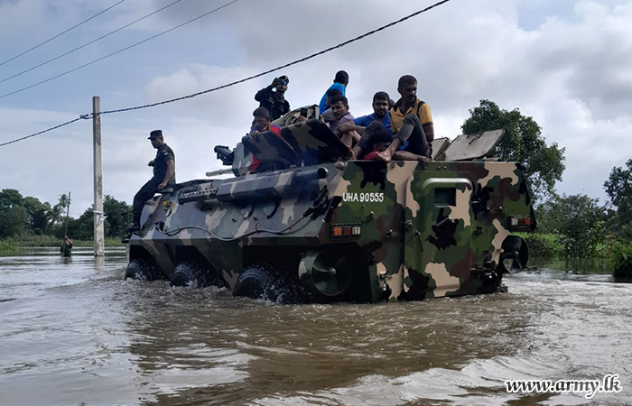 In a coordinated effort, troops of the 1 Sri Lanka Armoured Corps and the 2 (V) Sri Lanka Army Service Corps were deployed, utilising two armoured vehicles and boats to navigate the flooded areas and ensure the safe transport of the affected civilians.