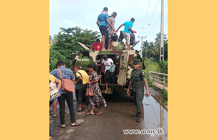 Due to the heavy rainfall in recent days caused by adverse weather conditions, the Katunayake, Awariwatta area in the Gampaha district has experienced significant flooding. In response to this emergency, the 141 Infantry Brigade facilitated transportation for 313 civilians to their workplaces on 05 June 2024.