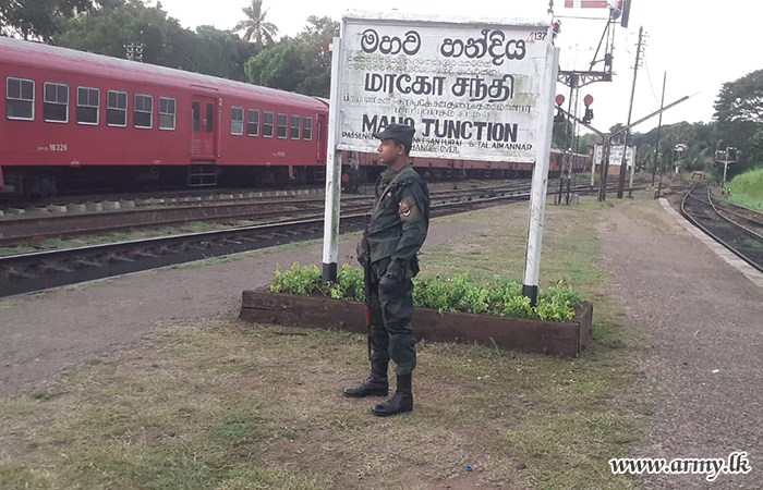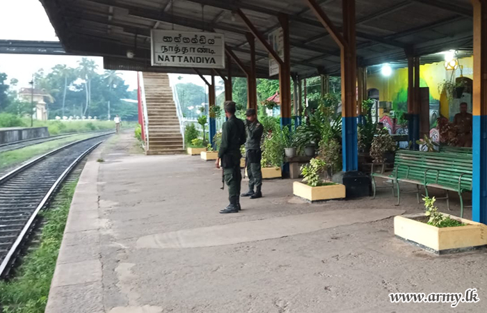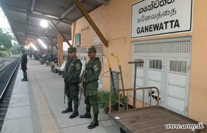 Under the supervision of the Security Forces - West and Security Forces - Central Commanders, Army troops have been deployed at 45 railway stations, including Kandy, Katugastota, Matale, Peradeniya, Gampola, Nawalapitiya, Hatton, Watawala, Kotagala, Thalawakele, Nanuoyya, Ambewela, Puttalam, Chilaw, Madampe, Nattandiya, Alawwa, Polgahawela, Kurunegala, and Mahawa.