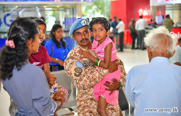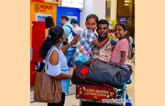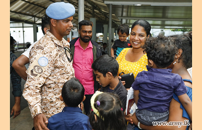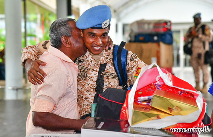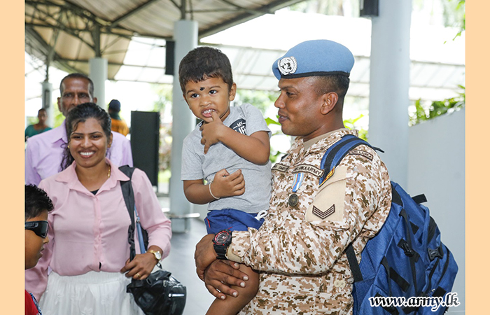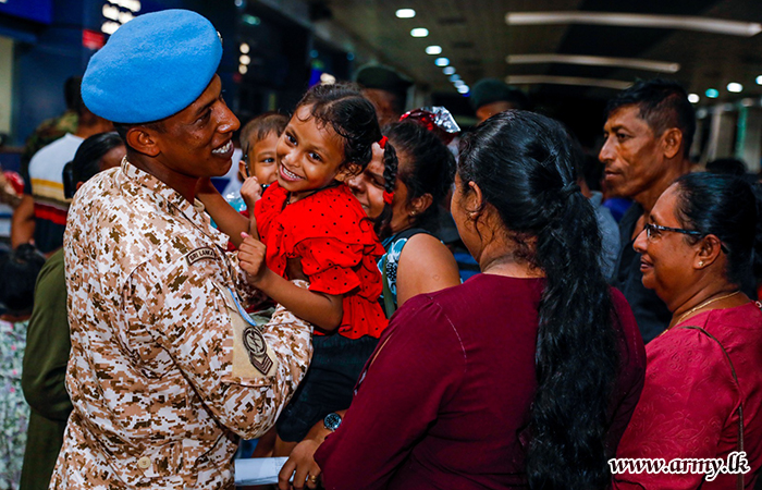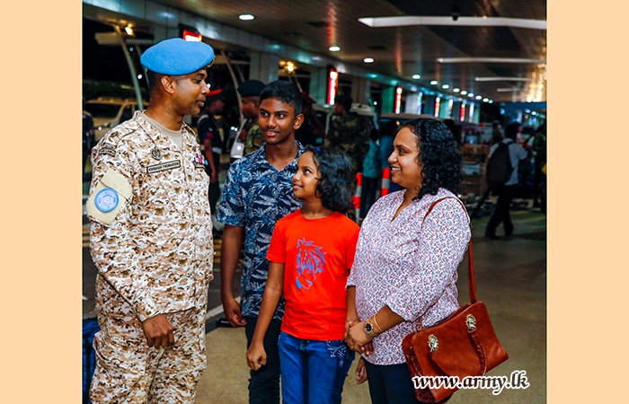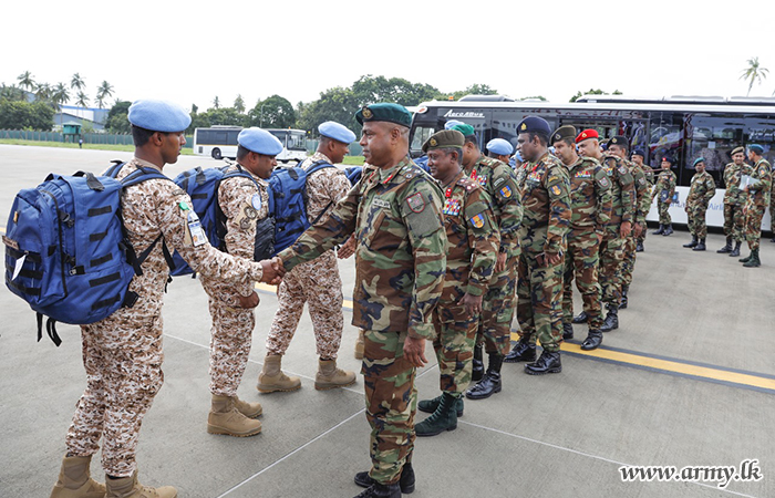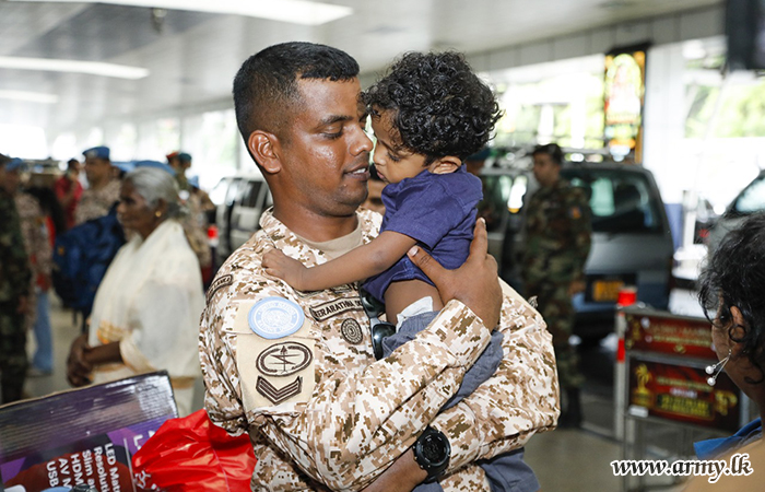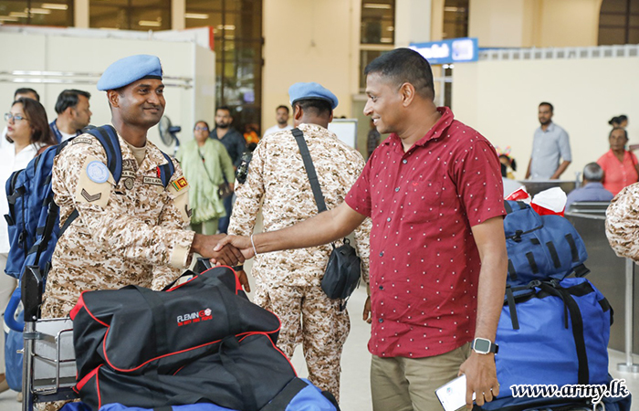 Upon arrival, the troops were warmly welcomed by Major General W.P.A.D.W. Nanayakkara RSP VSV USP ndu, Commandant Sri Lanka Volunteer Force and Colonel of the Regiment SLSR; Major General S.A.N.D. Edirisinghe RWP RSP Hdmc psc, Director General General Staff and Colonel Commandant SLCMP and a few representative Senior Officers of the Sri Lanka Army at the BIA.