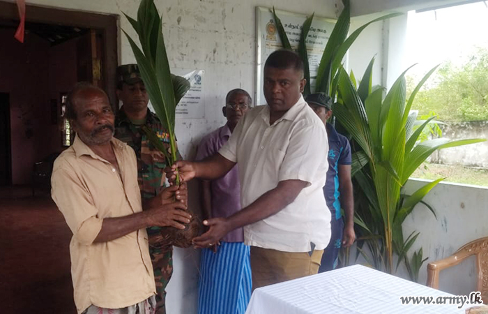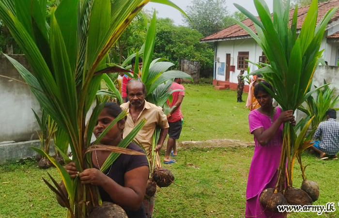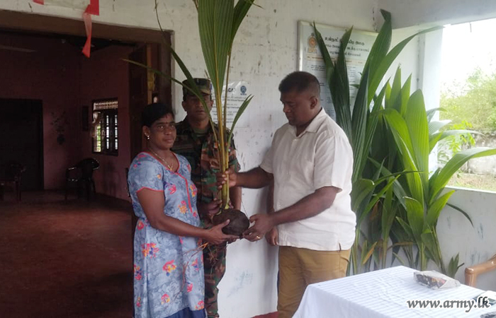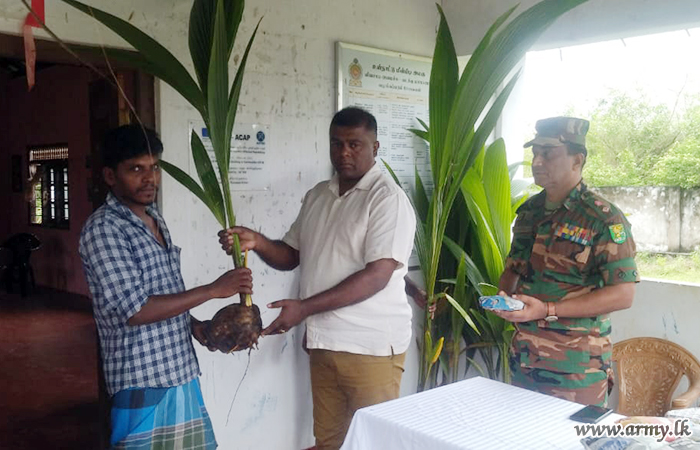 Brigadier D.N.C Serasinghe RSP USP, Commander 653 Infantry Brigade joined the distribution of those 125 coconut saplings and 50 lunch packets among 25 low income group families.