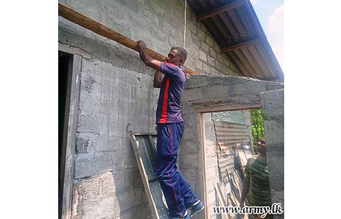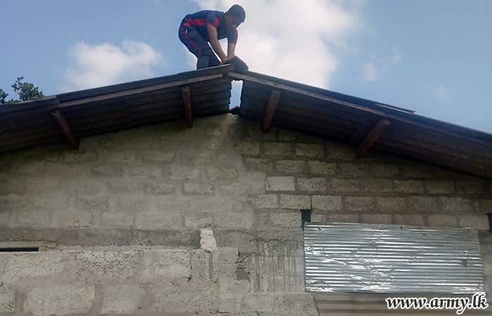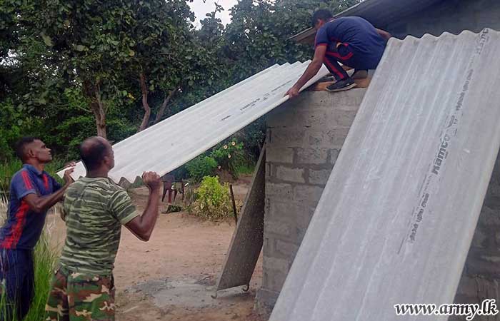The dilapidated house roof of Mrs. Magaline Perera who lives with her elderly husband in Monarathenna, Welikanda was relieved when 9 Sri Lanka Artillery (SLA) troops of the 233 Infantry Brigade voluntarily came forward to repair it considering their miserable plight.