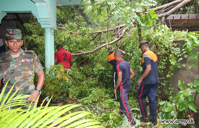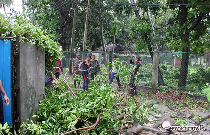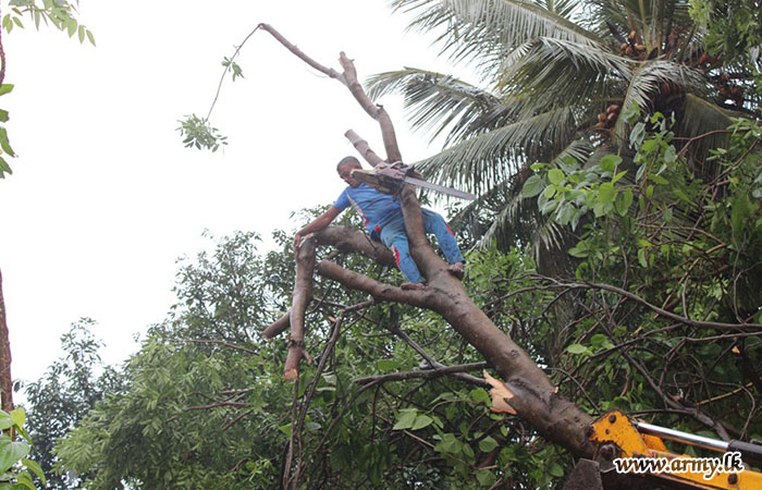 The troops of the 11 Sri Lanka National Guard assisted to clear a fallen tree at Sri Wijayarama Temple in Akkaraipattu on 10 January. The tree, toppled with the heavy rain and wind, had blocked the road leading to Dammarathana Sinhala School, disrupting traffic flow and causing a power outage.