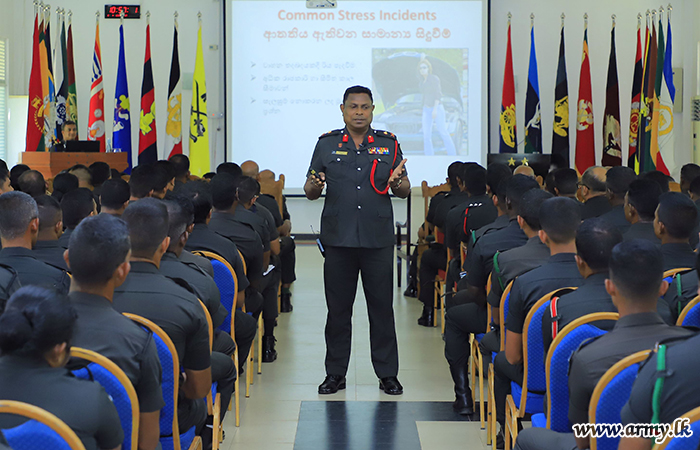 Facilitating the most required awareness and follow-up of stress management, a lecture was conducted to coincide with the first training day in the month of April at the Sri Lanka Army Volunteer Force (SLAVF) multifunctional hall on 19 April under the guidance of Major General W A S S Wanasinghe RSP VSV USP ndu, Commandant SLAVF.