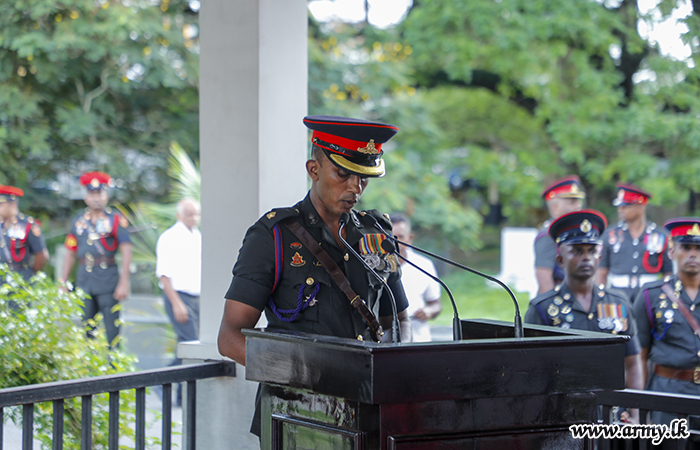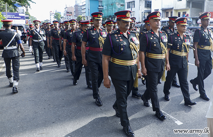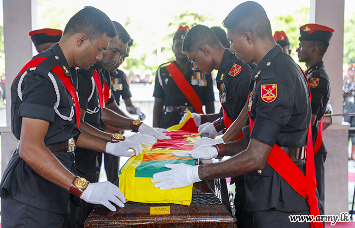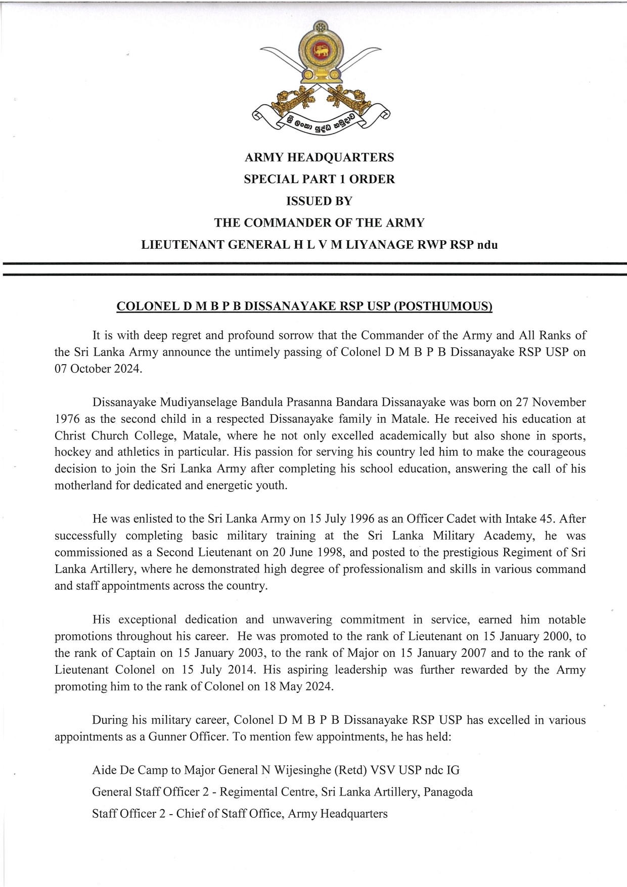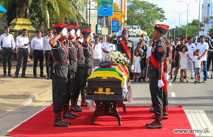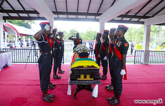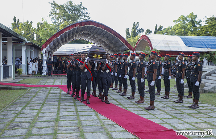 The formal Special Part I Order, issued by the Adjutant General of the Sri Lanka Army, was then read out to the mourners. Troops, in conformity with military traditions, saluted the deceased, presenting a symbolic gun salute, the highest honour a military Officer can receive upon his demise.