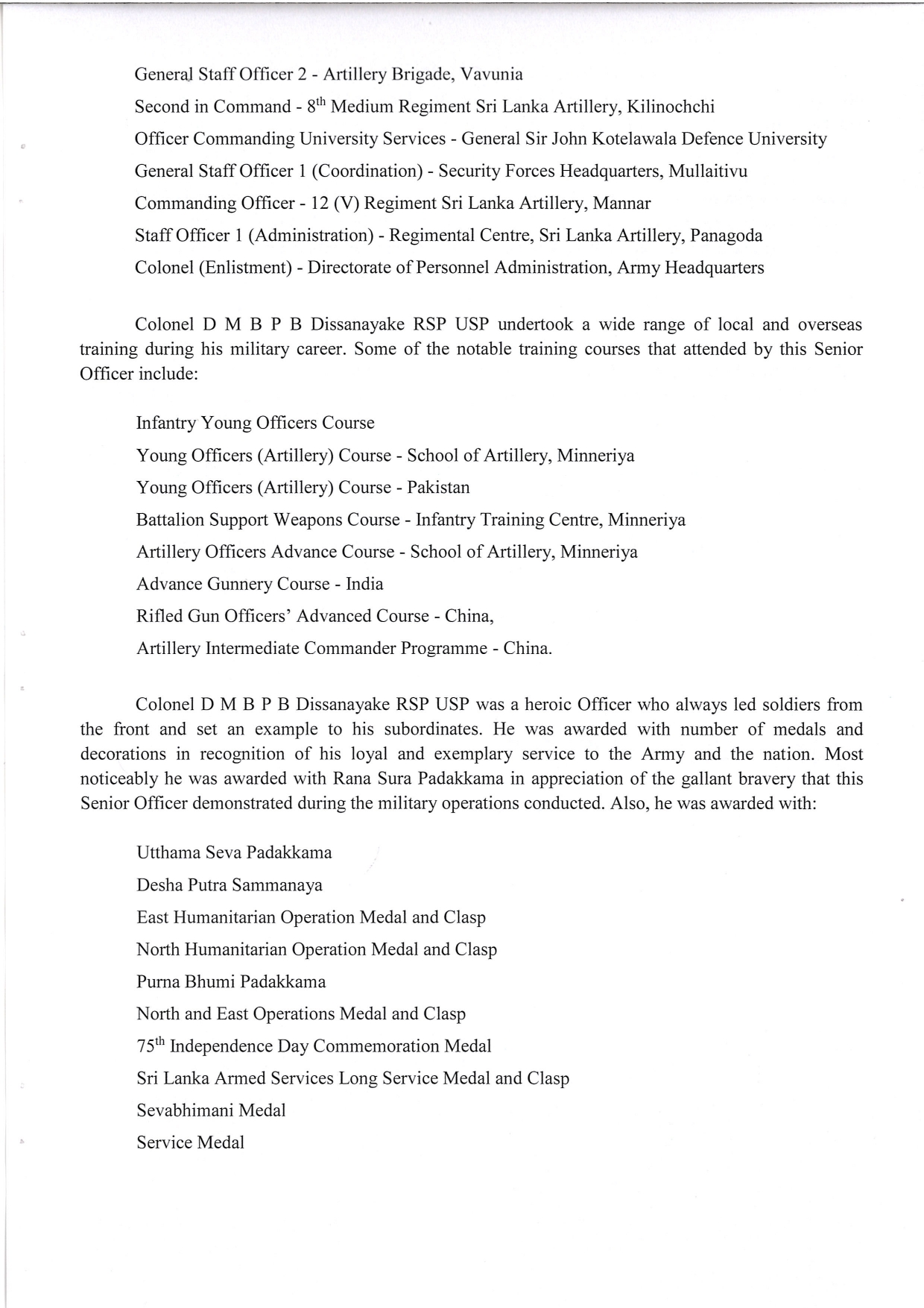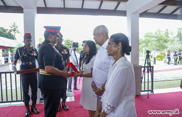 Afterwards, Major General B.K.G.M.L. Rodrigo RSP psc IG, Commandant of the Sri Lanka Army Volunteer Force and Colonel Commandant of the Sri Lanka Artillery, presented the bereaved family with the decorations and medals that Colonel D.M.B.P.B. Dissanayaka RSP USP had earned during his illustrious career, in keeping with military tradition.