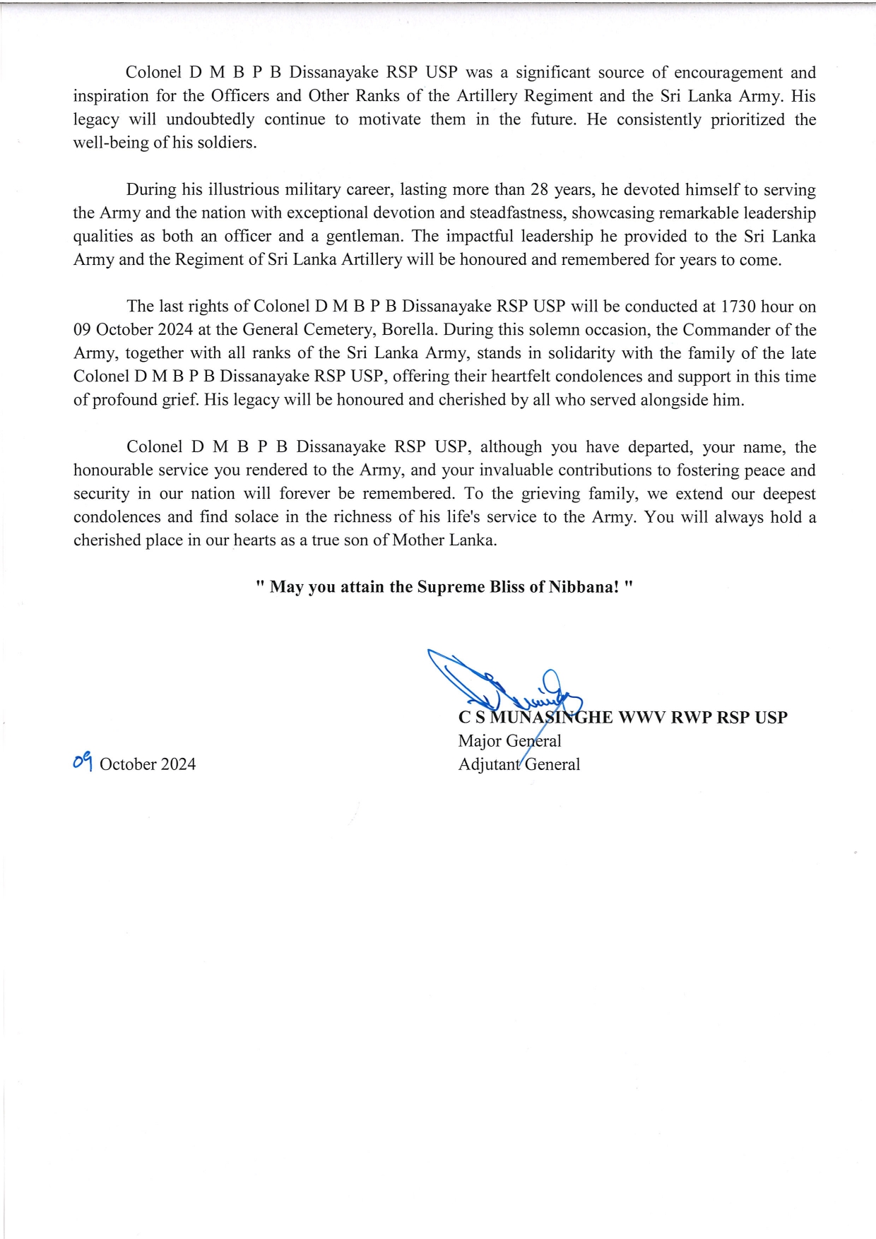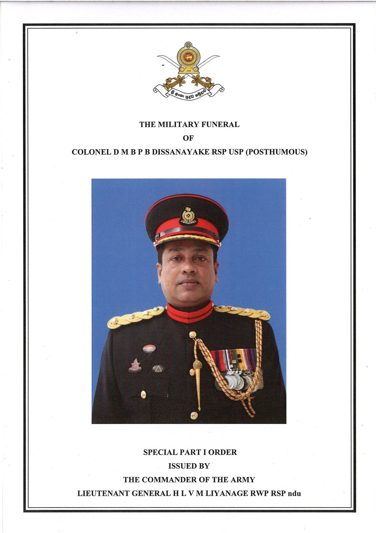 The military funeral of the late Colonel D.M.B.P.B. Dissanayaka RSP USP of the Sri Lanka Artillery, who served the country for more than 28 years, took place on Wednesday (09 Oct) afternoon at the Borella General Cemetery.