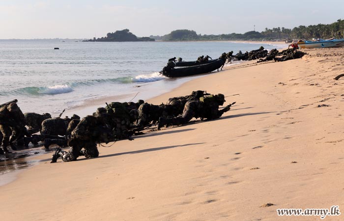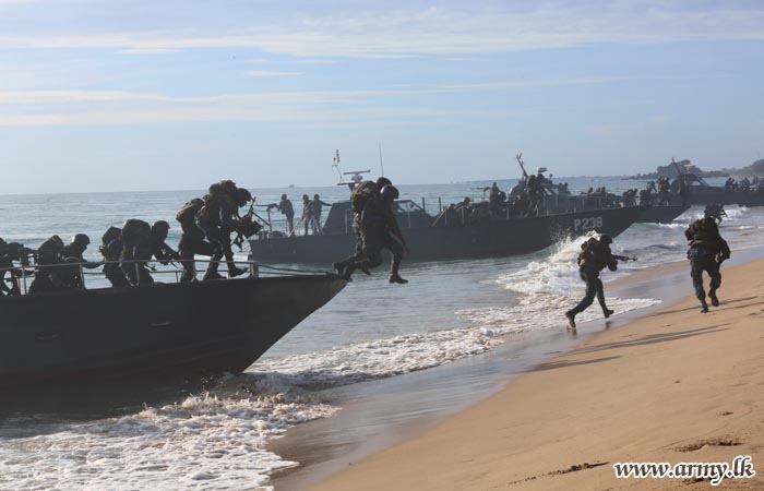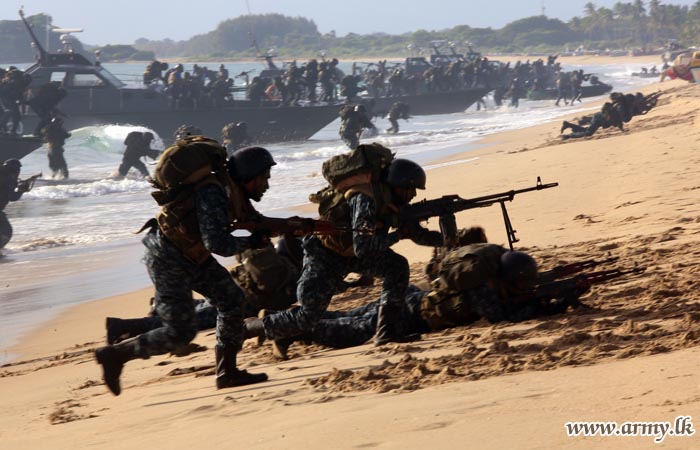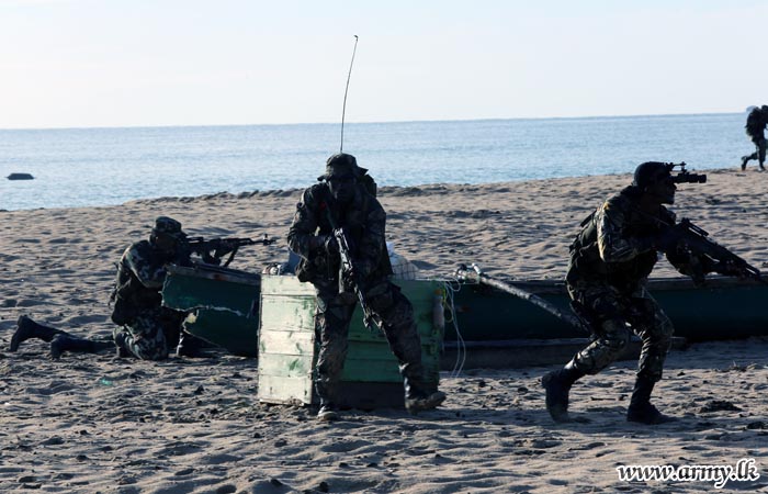 The near three-week long Exercise, will continue until 24, September, covering areas of the Eastern Province and a minor portion of the Security Force Headquarters - Wanni area consisted of parallel mock seaborne and airborne operations, special combat readiness operations and direct onslaughts against the mock enemy strongholds, conduct of joint operations using manoeuvrist approach, execution and planning of special operations, tactics, techniques and procedures, etc within given time frameworks during the period.
