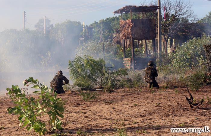 The Exercise at its final stages joins with Army troops for direct onslaughts against enemy strongholds. This Army-initiated mock Field Training Exercise (FTX), organized and implemented in close cooperation with Sri Lanka Navy and Air Force has been designed for deployment of their troops in a war milieu of Special Operations at any given moment and planned for conduct of joint operations as one team, using manoeuvrist approach, encompassing planning, execution and command which can be made operational at any given situation.