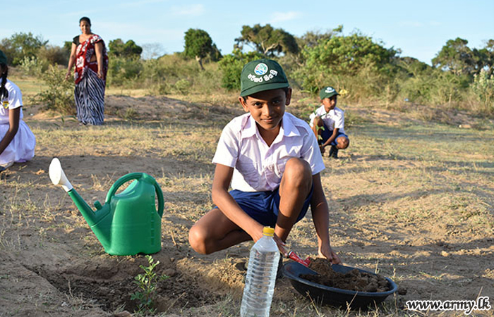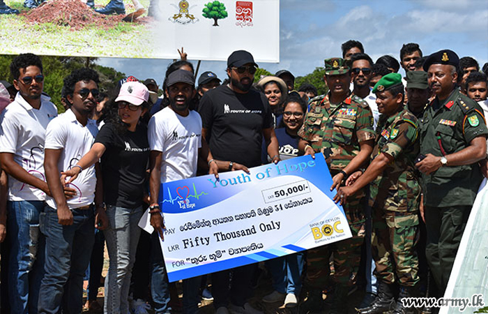 A host of environment friendly students, private donors and popular artists including the Faculty of Agricultural Science in the University of Sri Jayawardenapura, Principal, teachers and members of the Old Boys' Association at Naththandiya Dhammissara College, Associated Motorways Company, Youth of Hope Environment Organisation, Mr Saranga Disasekara, Ms Shanudi Priyasadh and Mrs Dulika Marapana, impressed with the Army's ongoing Wilpattu reforestation programme at Wilpattu National Park under the ‘Thuruliya Wenuwen Api’ project, conceptualized by the Commander of the Army Lieutenant General Mahesh Senanayake, joined hands with one more phase of sapling planting on Saturday (15).