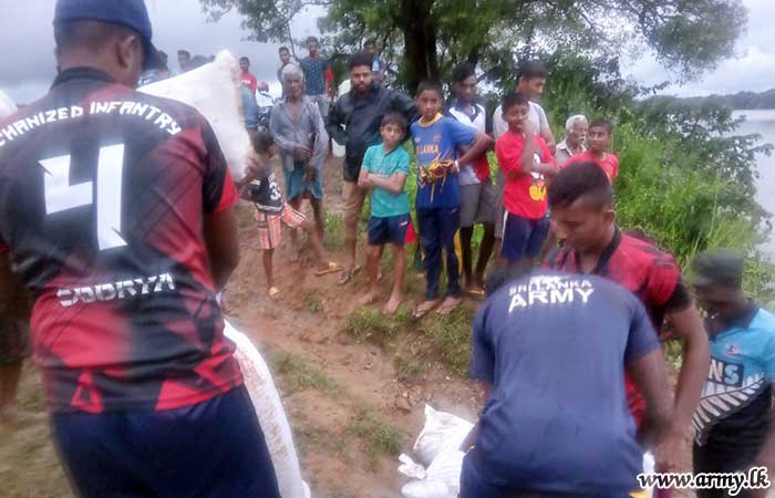 Troops of the Mechanized Infantry Regiment (MIR) HQ at Dambulla promptly attended to the threatened splits on the Dambuluhalmillewa tank bund in Palagala, Dambulla by placing sandbags on Sunday (10 December) after torrential rains filled the tank to its full capacity.