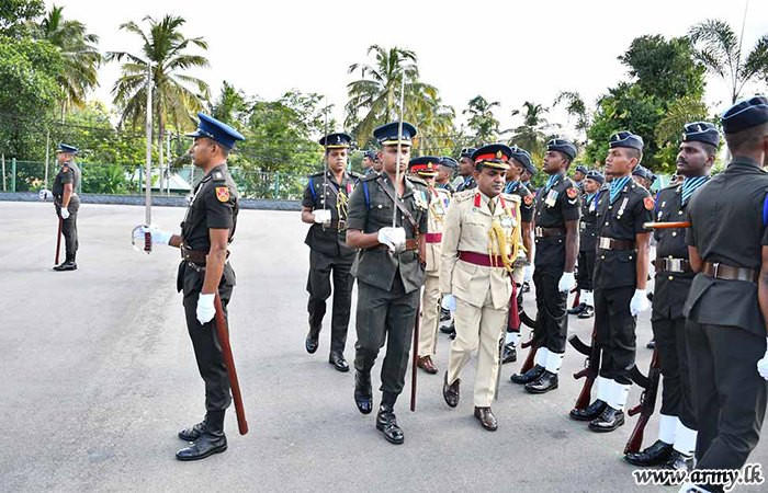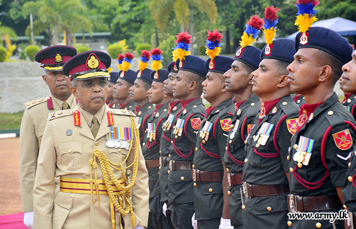 Troops of the Sri Lanka Army Medical Corps (SLAMC) upon arrival of their newly-promoted Colonel Commandant, Major General P.A.C Fernando USP at the Sri Lanka Army Medical Corps HQ premises in Werahera after receipt