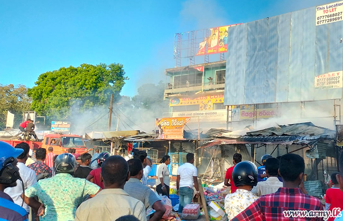 Troops of the Sri Lanka Army Vocational Trade School at Kuttigala immediately came forward to provide maximum support to extinguish a fire that erupted in a line of about 20 shops, situated around the main bus stand at Embilipitiya on Thursday (11).
