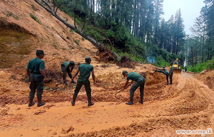 An earth mound that obstructed the public and vehicle movement on the Nallathanniya -Maskeliya main road, was entirely removed by 112 Brigade troops of the 11 Division on Friday (5) after torrential rains caused havoc. Major General Kalpa Sanjeewa...