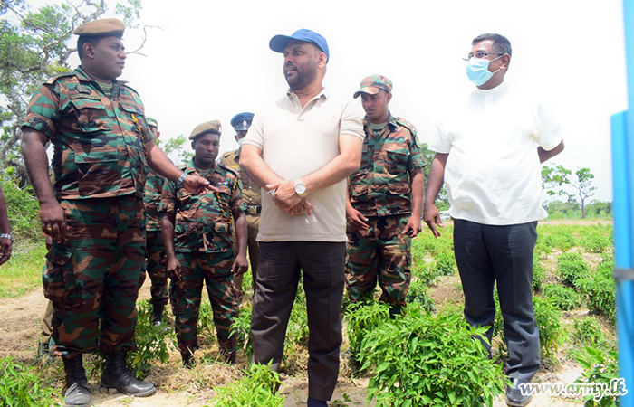 Hon Minister of Agriculture, Mahinda Amaraweera on Saturday (6) during a visit to the East dropped in at the Kandakadu Army farm with the intention of receiving a firsthand experience about the Army-managed maize and green chilli cultivations inside the farm.