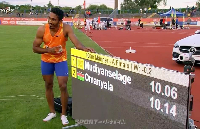 Staff Sergeant Yupun Abeykoon of the Sri Lanka Army Electrical and Mechanical Engineers (SLEME) at 100m open event in German Open Athletic Championship....