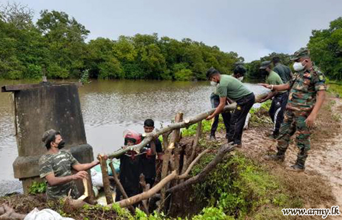 15 (V) Sri Lanka Sinha Regiment (SLSR) troops of the 562 Brigade under the 56 Division of the Security Force HQ - Wanni timely intervened and repaired the Ariyankulam tank bund in Nochchikulama area which was damaged on Friday (26) due to heavy rains...