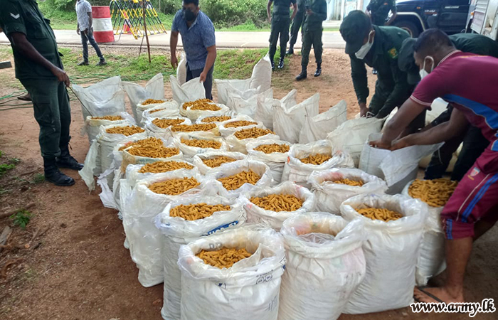Troops of 15 (v) Gemunu Watch (GW) under the 542 Brigade of the 54 Division HQ under the Security Force HQ - Wanni apprehended 1200 kgs of smuggled turmeric during a search at a roadblock in the general area of Kunchchikulam, Vavuniya on Sunday (24).
