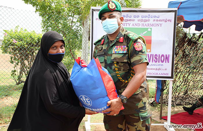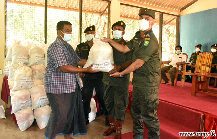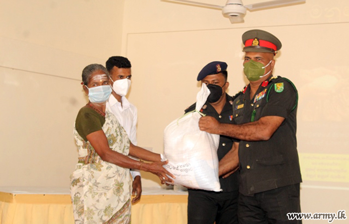 Troops of the 16 Sri Lanka Sinha Regiment and 17(V) Vijayabhahu Infantry Regiment under 561 Infantry Brigade on account of the 24th Anniversary of the 56 Division, with the sponsorship of Mr Prasad Lokubalasooriya of ‘Manushathwaye Sahana Yathrawa” in Colombo donated 50 dry ration packs among 50 needy families in Kanagarayankulam and Nedunkerny areas on 17 October 2021.