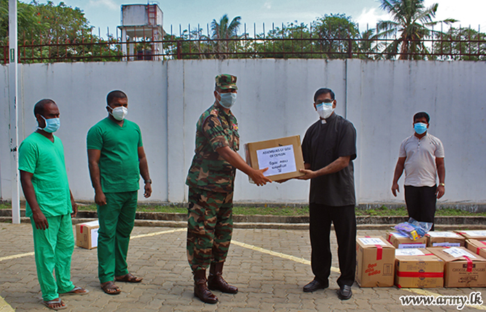 A stock of 100 packs of essential items, donated by Rev (Fr) Edward at Jaffna church were distributed among the inmates in quarantine at Vavuniya Intermediate Care Centre on Friday(10) after it was handed to the Security Force HQ-Wanni.