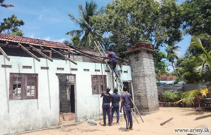 Responding to a humanitarian request made by Mrs Kaneshan Janeshvari, a resident in Vakarai area, Colonel Wasantha Hewage, Commander 233 Brigade took steps to renovate the partially-damaged roof of her house before starting the North East monsoon rainy season.