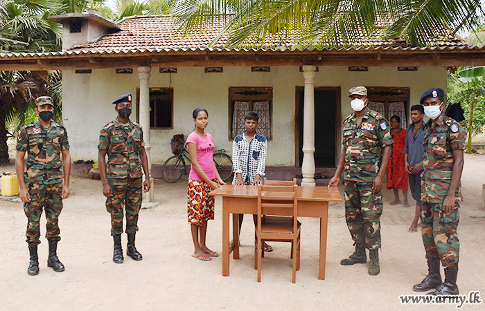 The Commanding Officer of the 7 Gemunu Watch (GW) of the 681 Brigade ,68 Division under the Security Force HQ-Mullaittivu, together with his troops, keen on supporting two needy students at Theravil, Mullaittivu who are clever at learning on Monday (9) donated a table and two chairs to them separately considering their hardships and other difficulties.