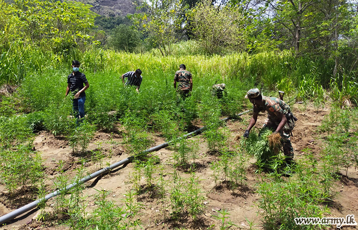 On information received from Military Intelligence, troops of the 12 Division under command to the Security Force HQ - Central on Friday (13) raided a Cannabis (Ganja) cultivation in the general area of Aluth Wewa in Koslanda and destroyed it.