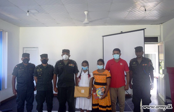 The District Manager of the Red Cross Society in Mullaittivu at the request of Brigadier Sujeewa Perera, Commander, 591 Brigade offered a scholarship to a student of a needy family on 27 July at the 591 Brigade premises.