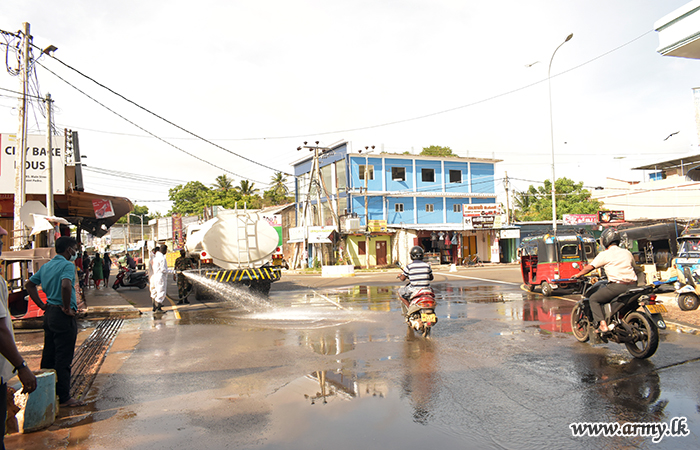 Troops of the 551 Brigade recently carried out a sterilization programme in Point Pedro town when the town was re-opened for the general public after a COVID-19 lockdown of 14 days.
