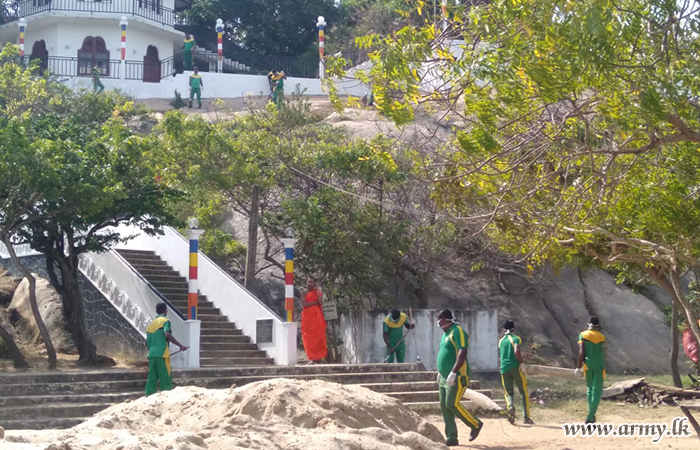 The ancient Krinda Rajamaha Vihara premises was thoroughly cleaned by troops of the 23 Gajaba Regiment under command to the 122 Brigade of the 12 Division under the Security Forces - Central in a 'Sharmadana' campaign during 15 -22 July in Kirinda.