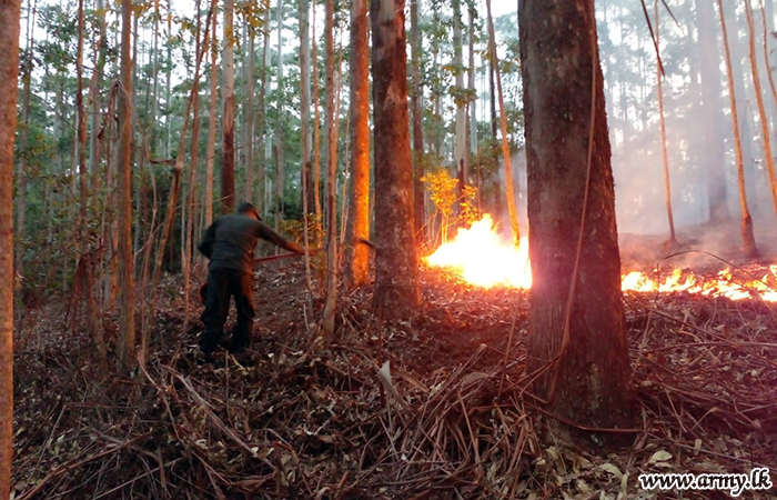 3 Sri Lanka Sinha Regiment (SLSR) troops swiftly responded and rushed to extinguish a fast spreading wildfire in the general forest area of Mahakudugala in Nuwaraeliya District after information to this effect was conveyed to the Army by the Disaster Management Centre (DMC) officials on Sunday (27).