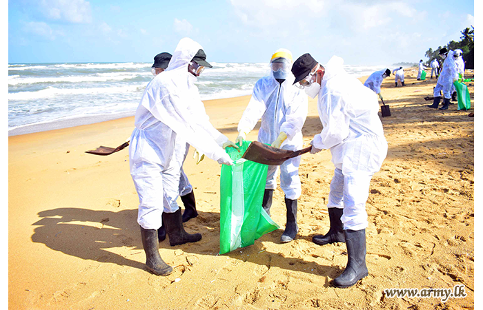 Troops of 9 Gemunu Watch of 582 Brigade under command to the 58 Division during 28 – 29 May 2021 cleaned the Wadduwa coastal belt which was affected due to debris of the damaged 'X Press Perl container ship...