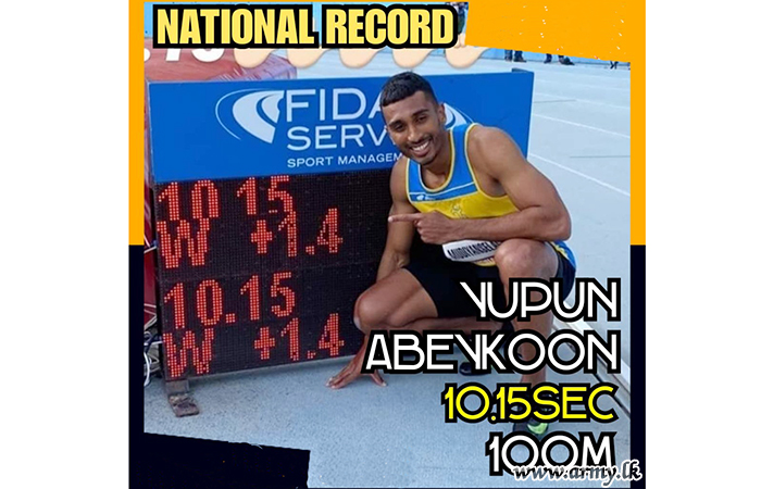Lance Corporal Y. Priyadarshana Abeykoon of Sri Lanka Electrical and Mechanical Engineers (SLEME) Regiment competing in the International Athletic Meet in Savona, Germany created a new South Asian record clocking 10.15 seconds in the 100 m run...